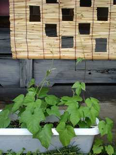 アサガオの蔓が伸びてきて、簾に絡んできました!